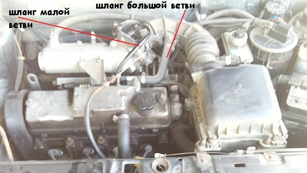 — На холостом ходу, при закрытой дроссельной заслонке картерные газы под действием высокого разрежения засасываются через сапун, его шланг под клапанную крышку на маслоотделитель. Далее, под действием того же разрежения, через тонкий шланг от клапанной крышки на штуцер с жиклером в дроссельный узел, под дроссельную заслонку и далее в камеры сгорания (малая ветвь). Жиклер ограничивает количество картерных газов, поступающих на холостом ходу, так как может нарушиться нормальная работа на этом режиме.
