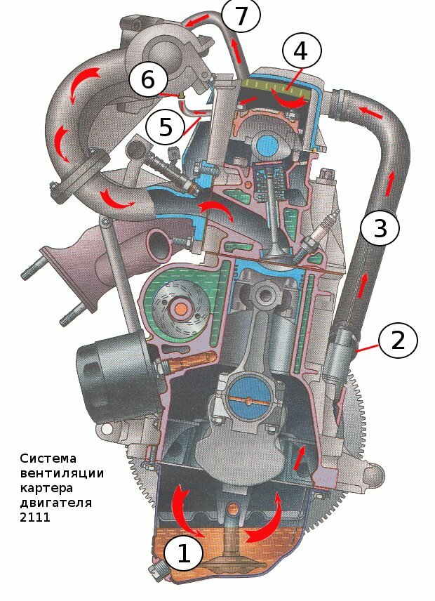 Чтобы уменьшить негативное влияние на ресурс мотора, была разработана система вентиляции. Она снижает давление, «высасывая» газы через систему патрубков, шланг и клапанов. Схематически она показана на рисунке.